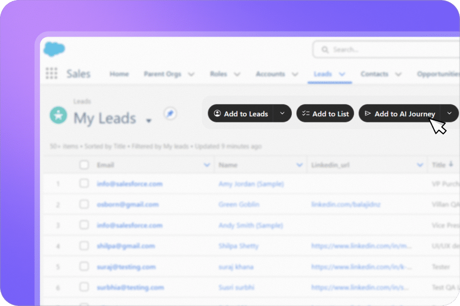From a LinkedIn profile or Sales Navigator search, create or update Leads, Contacts, Companies in SuperAGI with smart field mapping and dedupe.