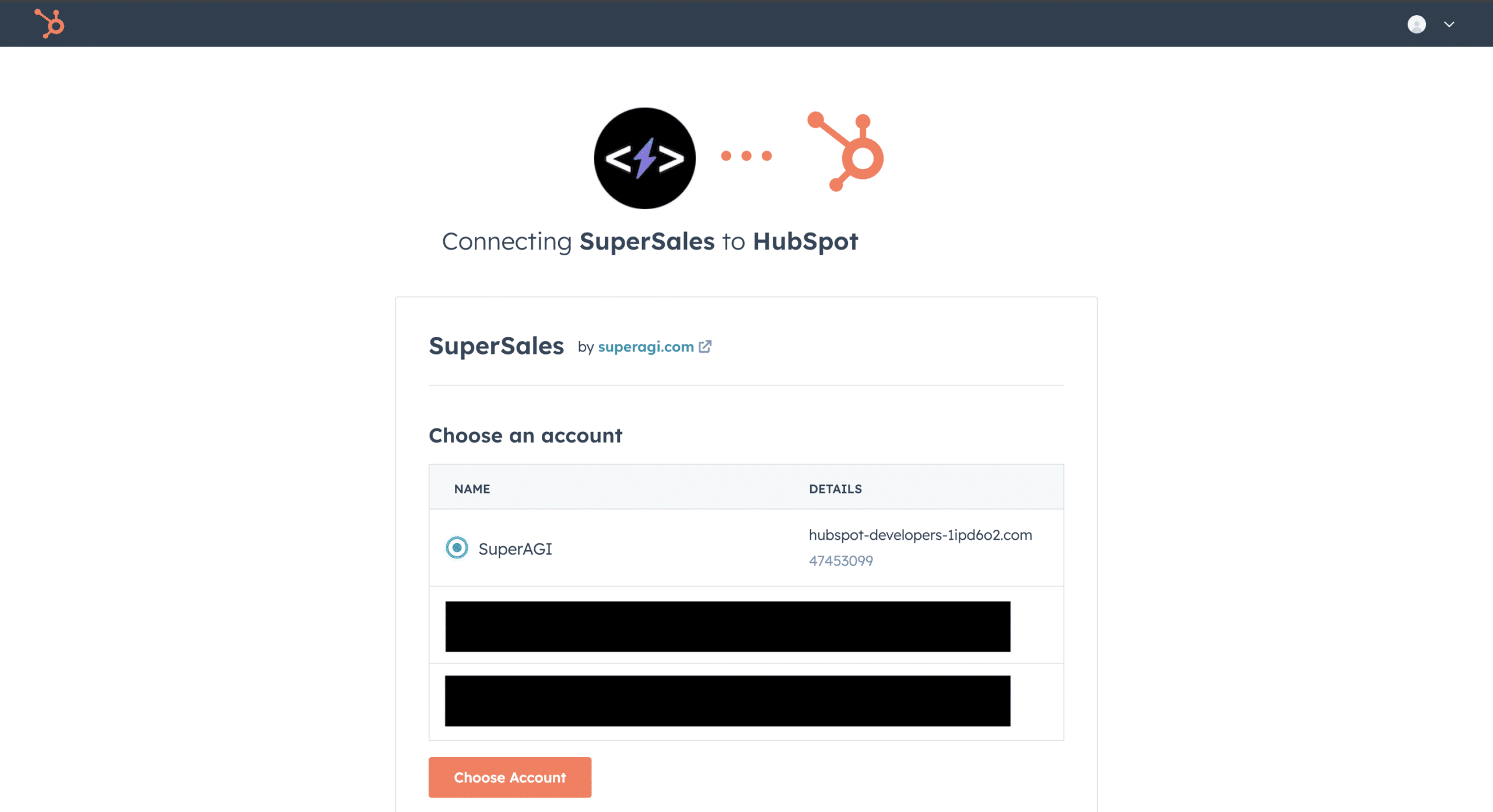 Step 2: Select the hubspot account you wish to connect with SuperSales and continue.